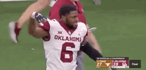 An Oklahoma Sooners football player, number 6, celebrates on the sideline during the Big 12 Championship.