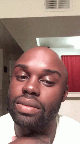 A bald man with a beard makes various expressive facial reactions, looking up and rolling his eyes.