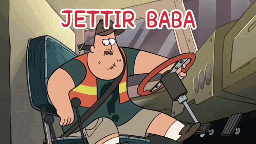Soos from Gravity Falls intensely driving a vehicle with 'Jettir Baba' text overlay.