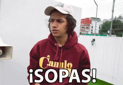 Harold Benny vigorously shakes instant noodles, exclaiming '¡Sopas!' in a moment of surprise.