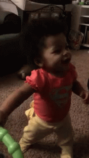 Sophia Davis, a baby in a red shirt and yellow pants, attempts to walk and then tumbles onto the carpet.