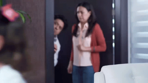 A man from Enchufetv peeks from behind a door, annoying a woman who reacts with frustration and anger.