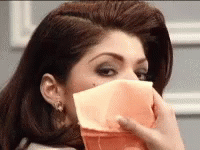 Soraya Montenegro, the iconic telenovela character, covers her face with a napkin, looking intensely at the camera.