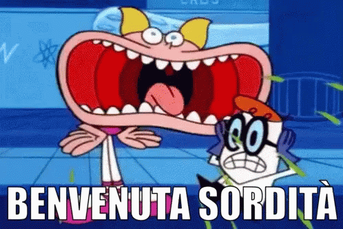 A cartoon meme featuring Dexter's Laboratory characters with the Italian text 'BENVENUTA SORDITÀ' (Welcome Deafness).