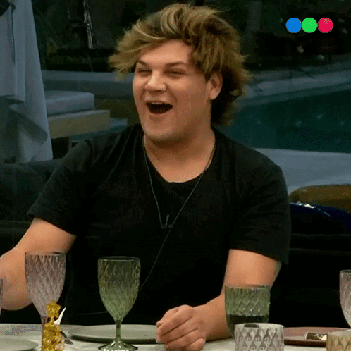 Emmanuel from Gran Hermano laughs heartily while sitting at a table with glasses, appearing surprised.