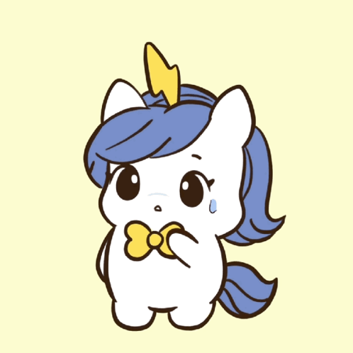 A cute unicorn with a lightning bolt horn and bow tie looks worried, expressing apology or regret.