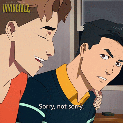 Mark Grayson delivers an unapologetic 'Sorry, not sorry' line in a scene from Invincible.