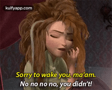 An animated character with messy hair reacts to being woken up, humorously denying it with a classic line.