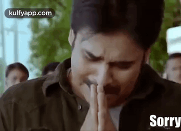 Telugu actor Pawan Kalyan makes a heartfelt sorry gesture with his hands, expressing regret.