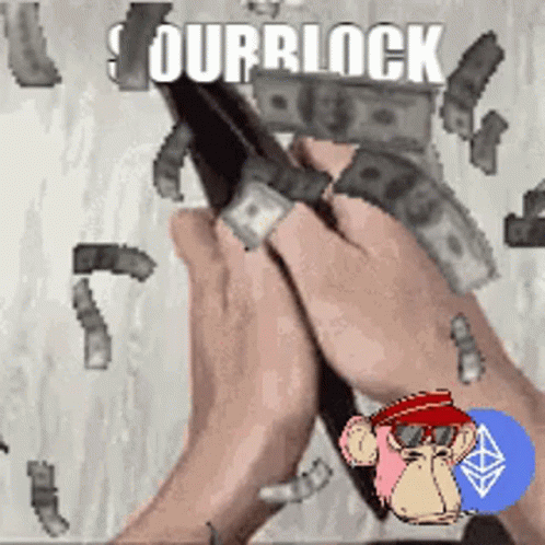 Sourblockmc meme featuring a person showered with money, alongside a Bored Ape NFT and Ethereum logo.