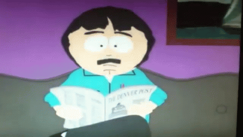 Randy Marsh reads the newspaper, followed by Cartman, Kyle, and Tweek looking shocked.