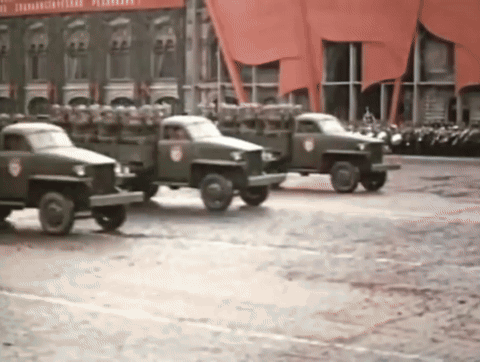 Vintage footage of a Soviet military parade in 1945, featuring trucks carrying large searchlights.