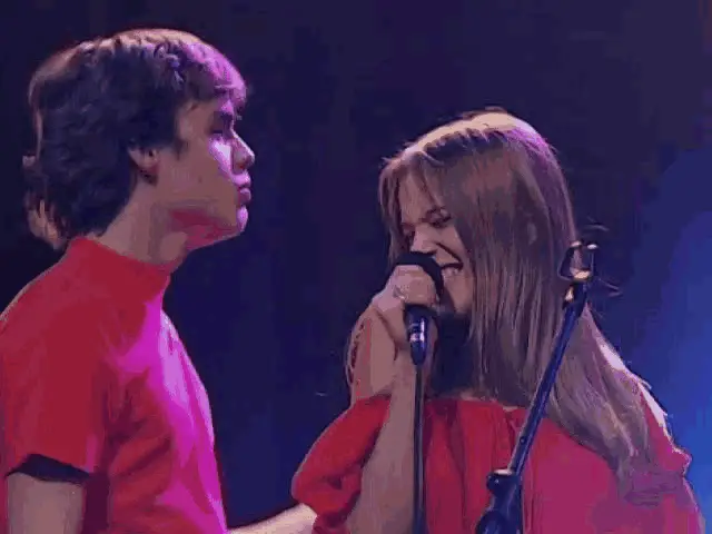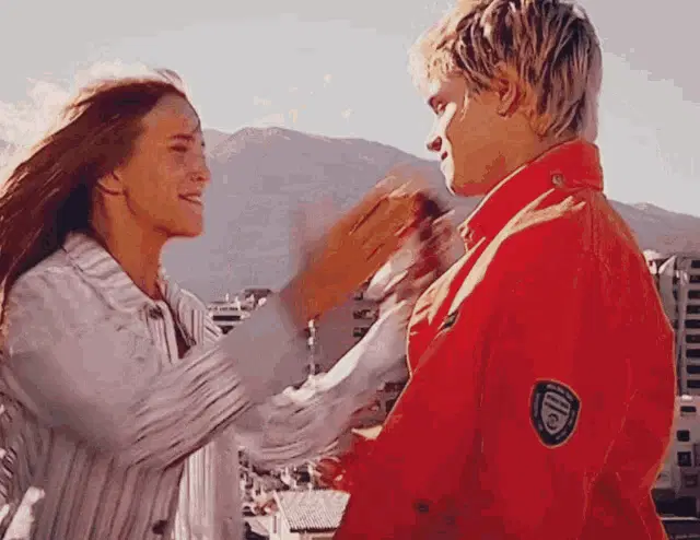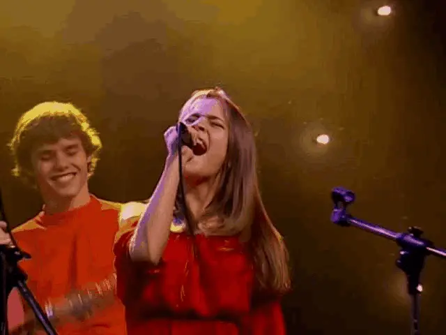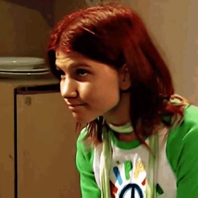 Camila Bordonaba, known for Rebelde Way, smiles in a close-up shot, wearing a red shirt with a blue collar.