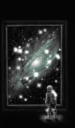 An astronaut stands before a window, gazing at a vast, twinkling galaxy filled with stars.