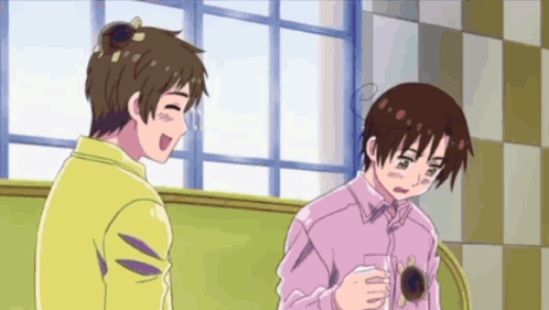 Spamano Hetalia characters Spain and Romano interact in an animated scene, with Spain smiling at a shy Romano.