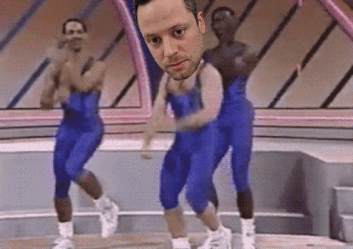 Three men in blue spandex leotards perform aerobics, one with an edited head, in a retro workout video.