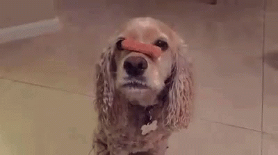 A cocker spaniel dog expertly balances a treat on its nose before catching and eating it.