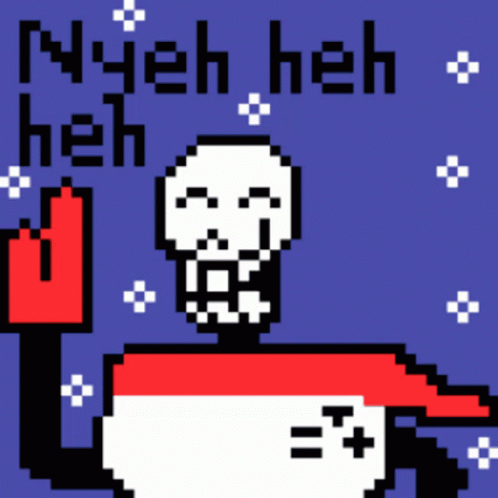 Papyrus from Undertale laughing with his iconic 'Nyeh Heh Heh' catchphrase, featuring sparkles and pixel art.