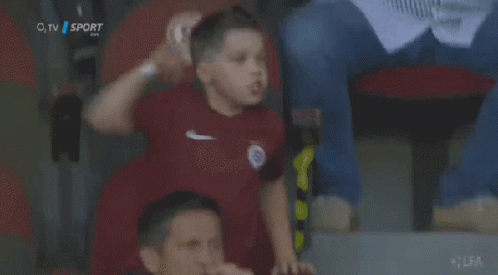 Young AC Sparta Prague fan celebrates enthusiastically in the stands, pumping his fist and clapping after a goal.