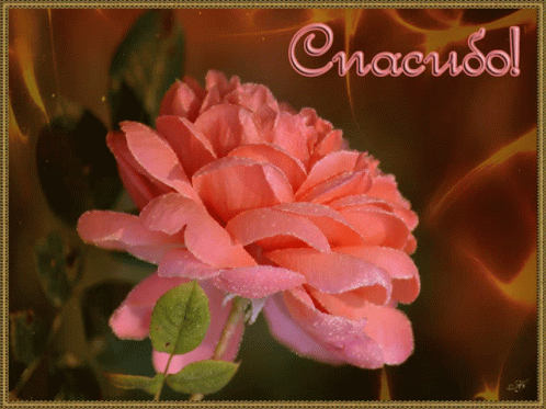 A beautiful pink rose with water droplets, featured on a greeting card with the Russian word 'Спасибо!' (Thank you!).