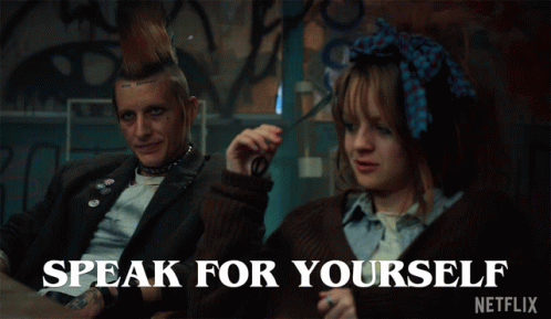 A man with a mohawk and a woman in a scene from Stranger Things, with the text 'Speak For Yourself'.