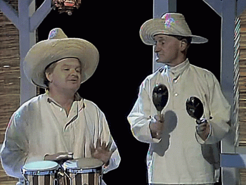 Benny Hill and a companion in sombreros play bongos and maracas, with the caption 'Catorce Centímetros'.