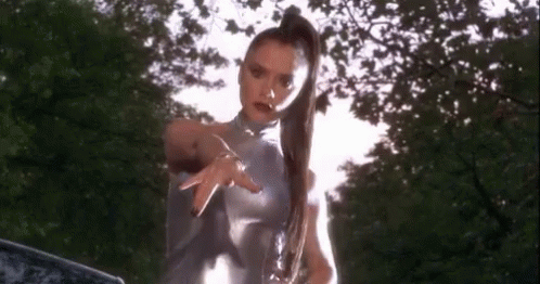 Victoria Beckham, also known as Posh Spice, striking a dynamic pose in a silver outfit outdoors.