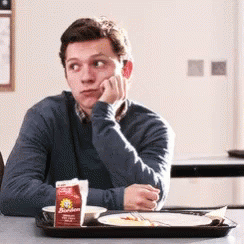 Peter Parker (Tom Holland) looking bored in the cafeteria with a milk carton in Spider-Man: Homecoming.