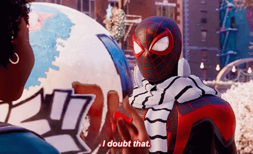 Miles Morales as Spider-Man, wearing a scarf, tells a woman 'I doubt that' in a snowy city setting.