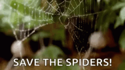A close-up of a delicate spider web covered in dewdrops, featuring the impactful message 'SAVE THE SPIDERS!'