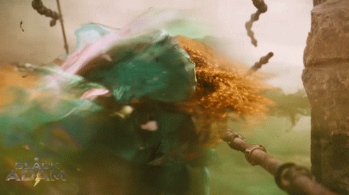 Quintessa Swindell as Cyclone, harnessing wind power and spinning in an action sequence from Black Adam.
