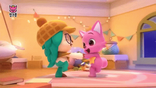 Pinkfong and Hogi playfully spin around while holding hands, enjoying a happy moment together in a colorful room.