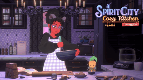A character from Spirit City Cozy Kitchen stirs ingredients in a bowl, preparing to bake cookies with Squire Sprout.