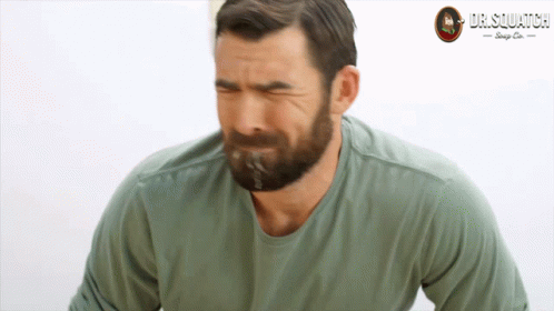 A man with a beard in a green shirt reacts with a surprised spit take, featuring a Dr. Squatch logo.