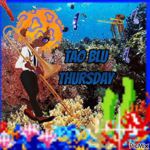 An animated Splatoon character, Tao Blu, plays a trombone underwater with 'Tao Blu Thursday' text displayed.
