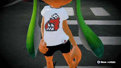 An Inkling character from Splatoon is shown in the game's hub world, featuring custom gear and dialogue.