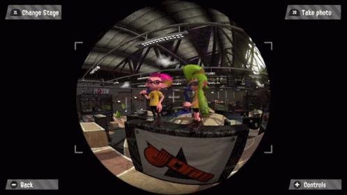 Splatoon 2 gameplay featuring an Inkling character in a training area, viewed with a fisheye lens effect.
