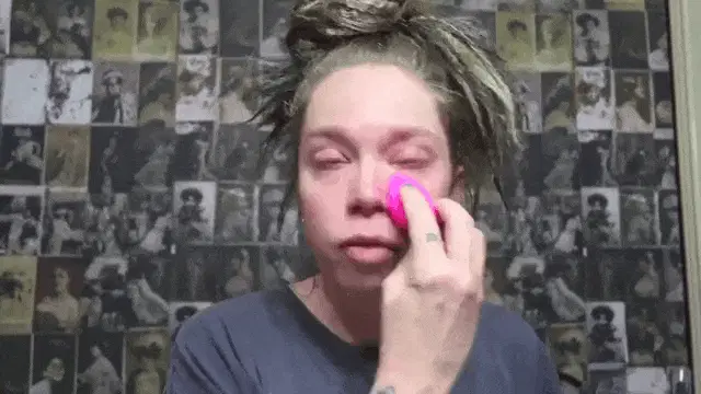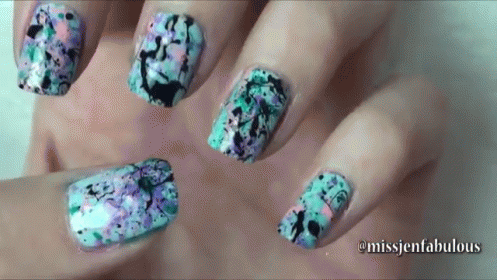 Close-up of a hand showcasing a vibrant splatter nail art design with mint green, purple, pink, and black polish.