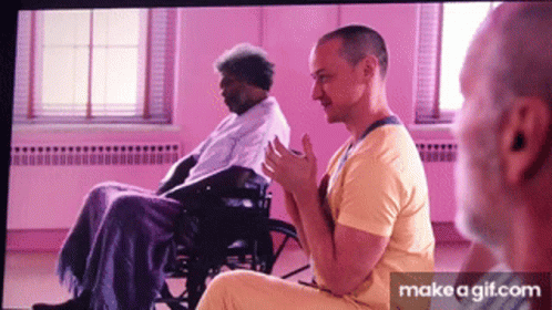 James McAvoy as Patricia claps his hands, while Samuel L. Jackson as Mr. Glass sits in a wheelchair nearby.