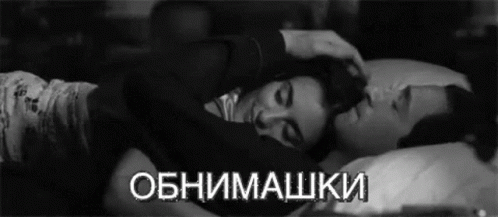 A couple embracing in bed, with the Russian caption 'ОБНИМАШКИ' (HUGS).