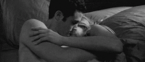 A couple shares tender hugs and kisses in bed, captured in a black and white intimate moment.