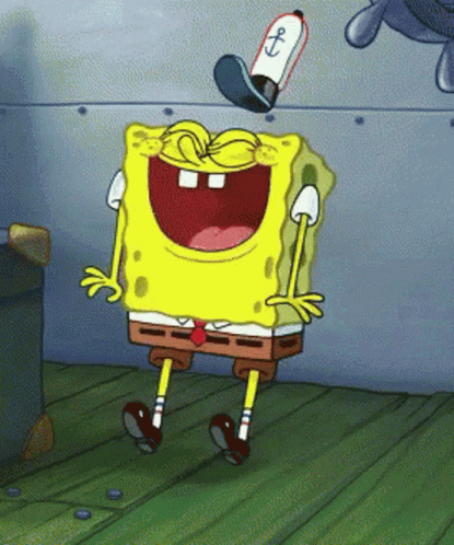 Spongebob Squarepants bursts into hilarious laughter, eyes closed and mouth wide open, as his sailor hat flies off.
