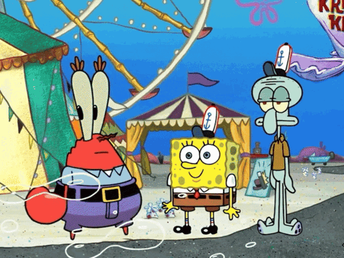 Spongebob extinguishes Mr. Krabs, who is comically on fire, at a vibrant carnival with Squidward.