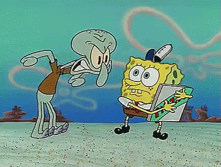 Spongebob Squarepants reacts with a firm 'Nö' to Squidward, holding a pizza box.