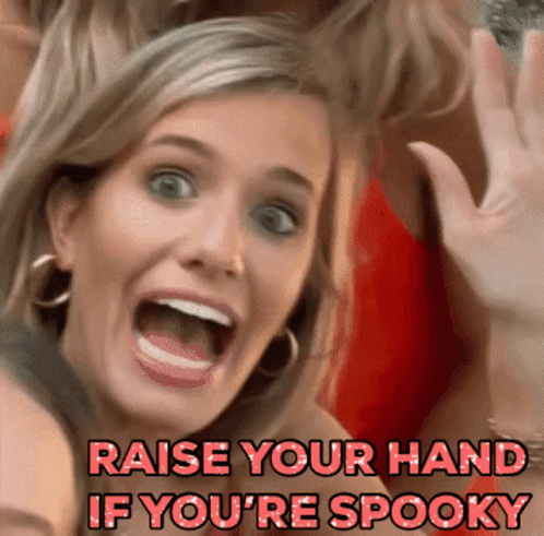 A woman with a wide-eyed, open-mouthed expression reacts to the text "RAISE YOUR HAND IF YOU'RE SPOOKY."