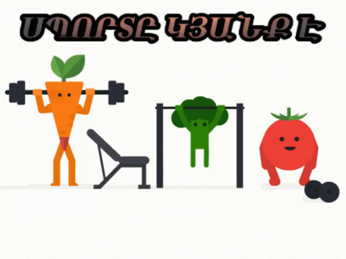 Animated carrot, broccoli, and tomato exercising, promoting a healthy lifestyle.