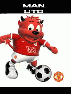 Manchester United's red devil mascot playing soccer with a ball, depicted in a sports cartoon style.