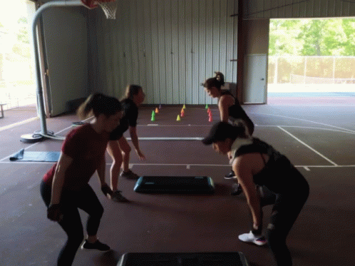 Four women performing a high-intensity interval training (HIIT) workout with step platforms at a sports village.