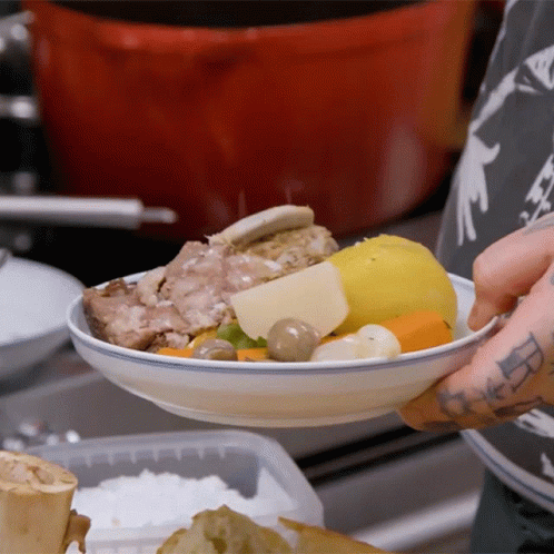 Chef Matty Matheson expertly sprinkles salt over a delicious bowl of boiled dinner, adding the perfect seasoning.