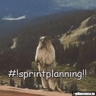 A marmot stands on its hind legs, seemingly reacting to the text '#!sprintplanning!!' in a humorous meme.